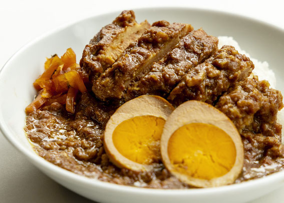 濃厚スパイシーなカレーの中に、どでかいトンカツと卵がドカン入ったヤバすぎるカレー。超最先端のカツカレーを是非お試しください。